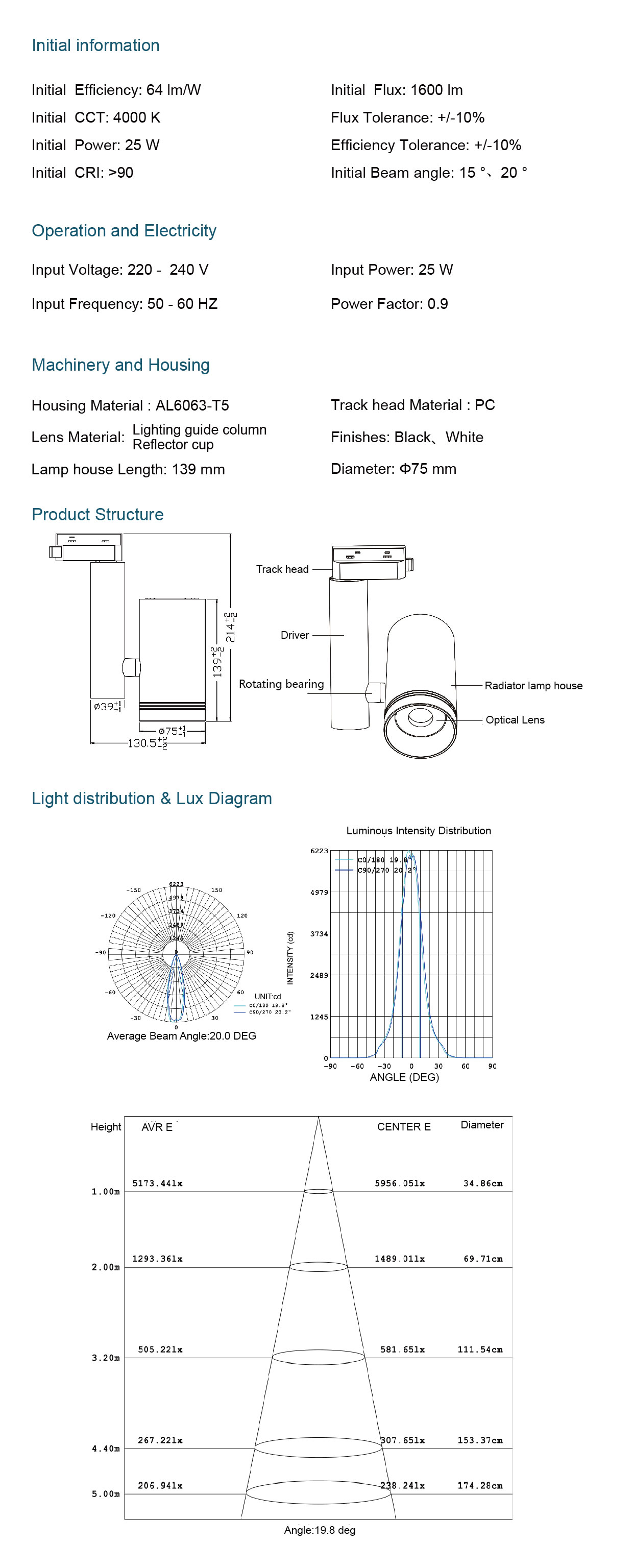 Power: 25 W Total Flux: 1800 lm CENTER E: 2390、1490 lx CRI: ≥80 Beam Angle: 15°、20° Warranty: 3 years Finishes : Black、White