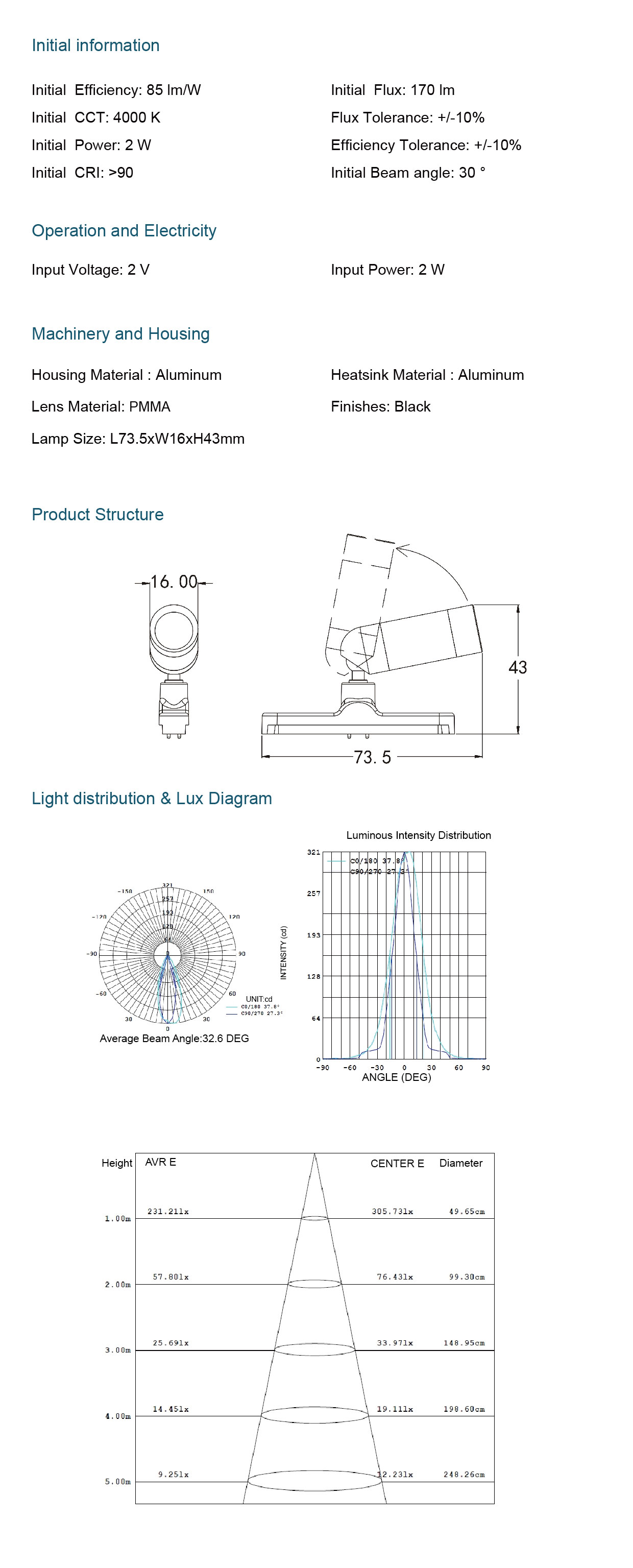 Power: 2 W Total Flux: 170 lm CENTER E: 76 lx 2m CRI: ≥80 Beam Angle: 30° Warranty: 3 years Finishes : Black